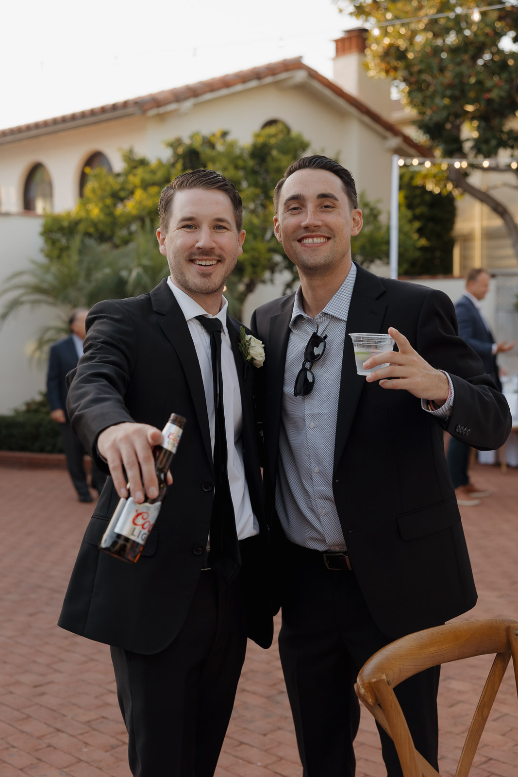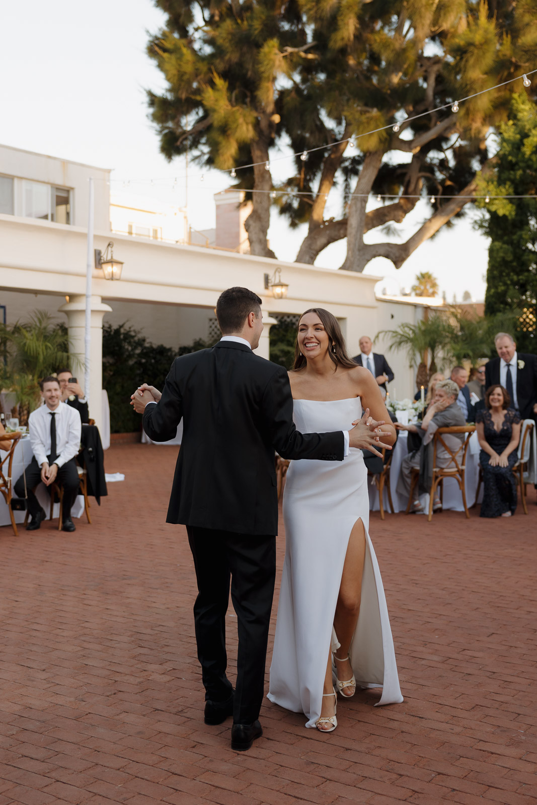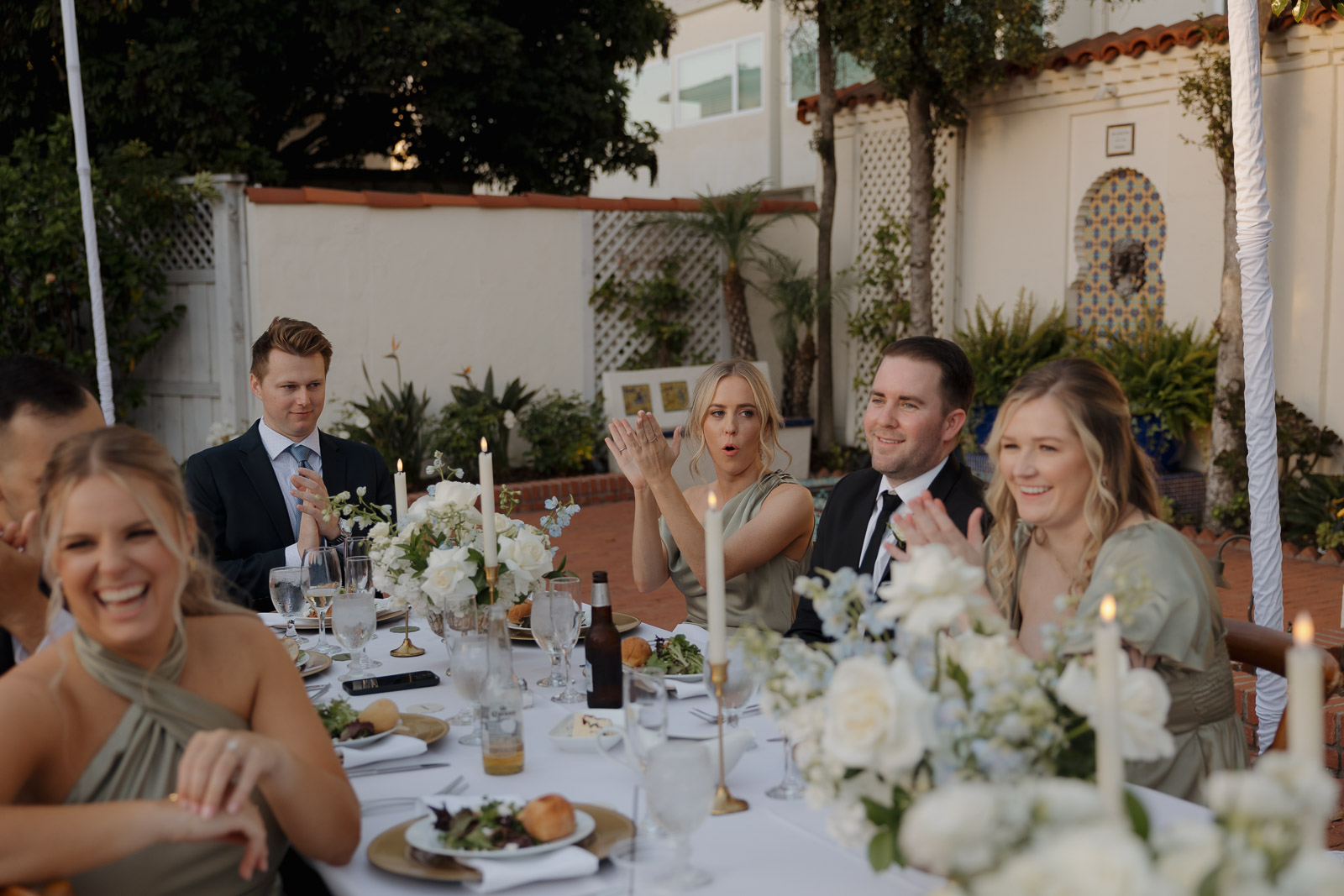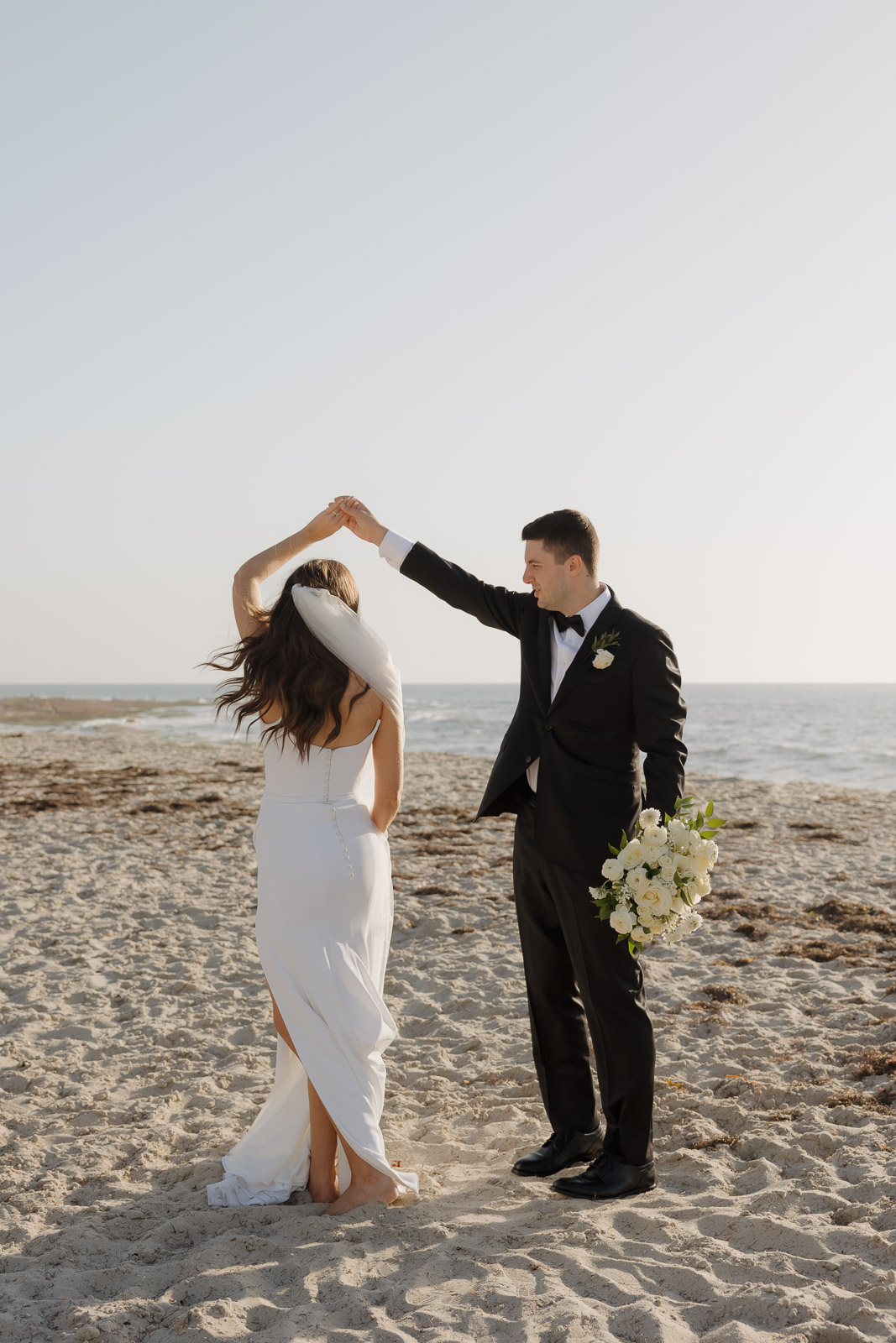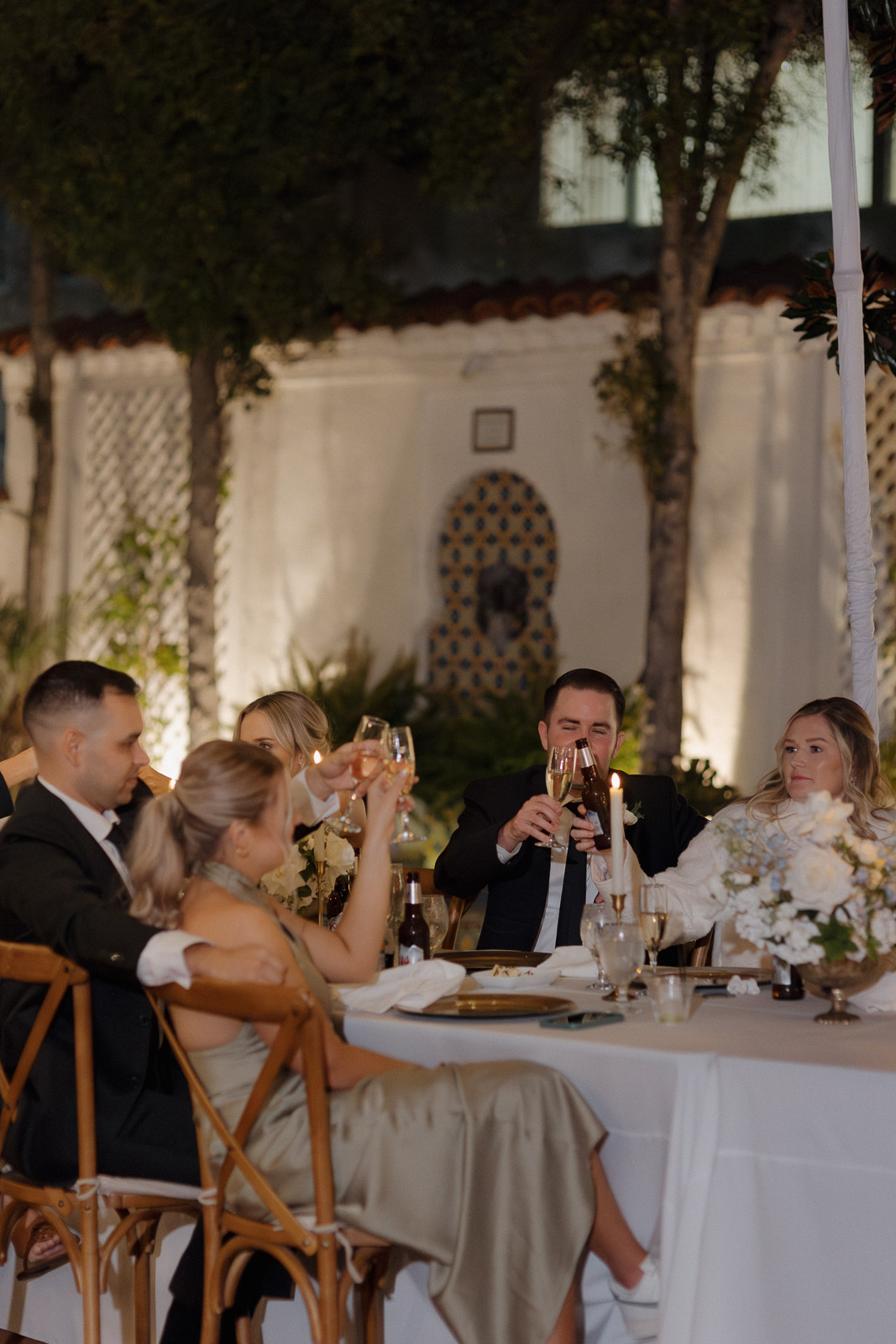 They wanted the day to feel heartfelt and classic, but also full of fun—and it absolutely was. Thoughtful touches celebrated family, like Allison wearing her grandmother’s garter and having their future brother-in-law officiate the ceremony in the romantic garden courtyard. After a tearful ceremony and a quick walk to the beach for some playful sunset portraits, the party officially began.